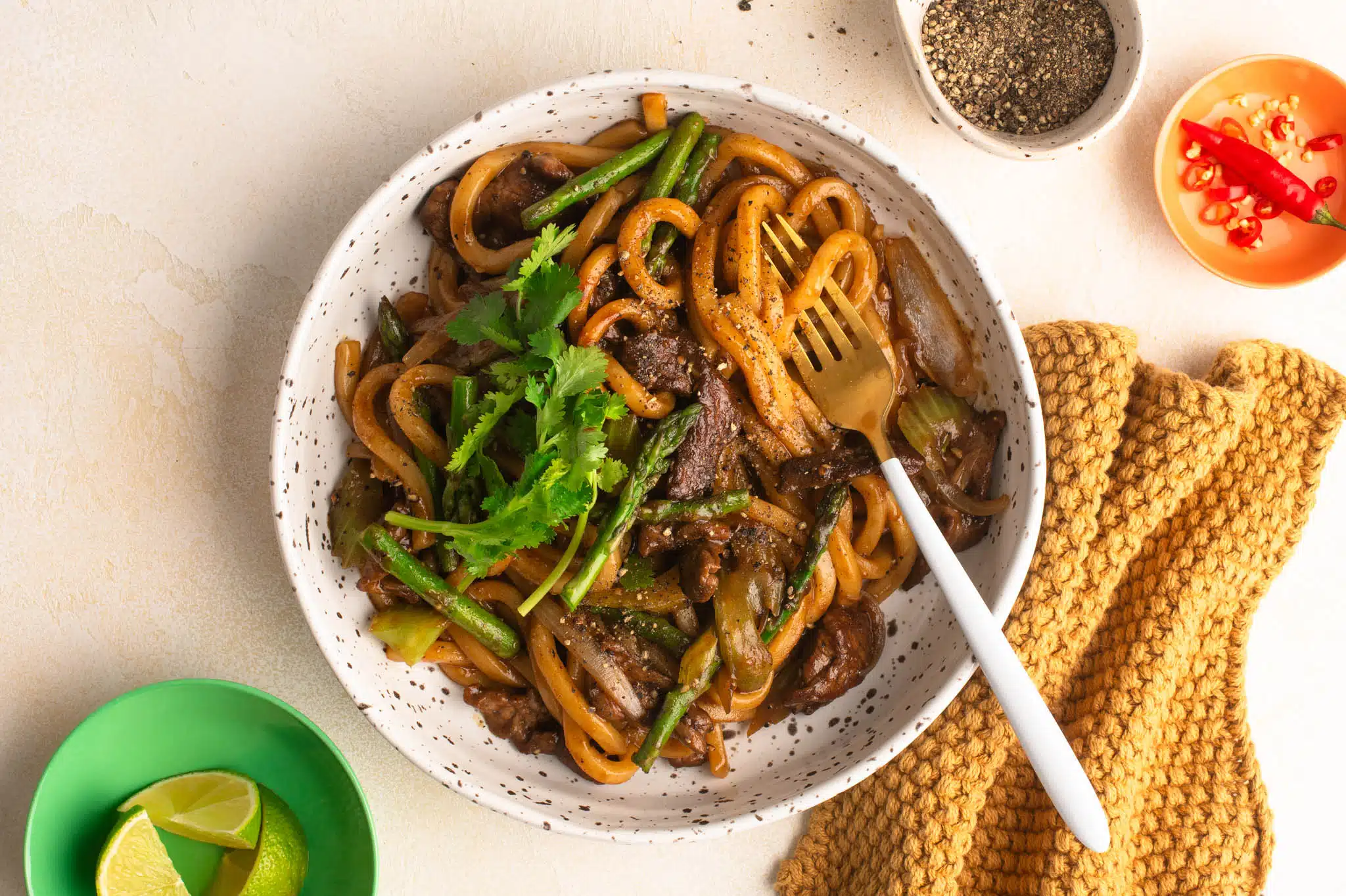 - Return the beef to the pan and stir through the noodles.