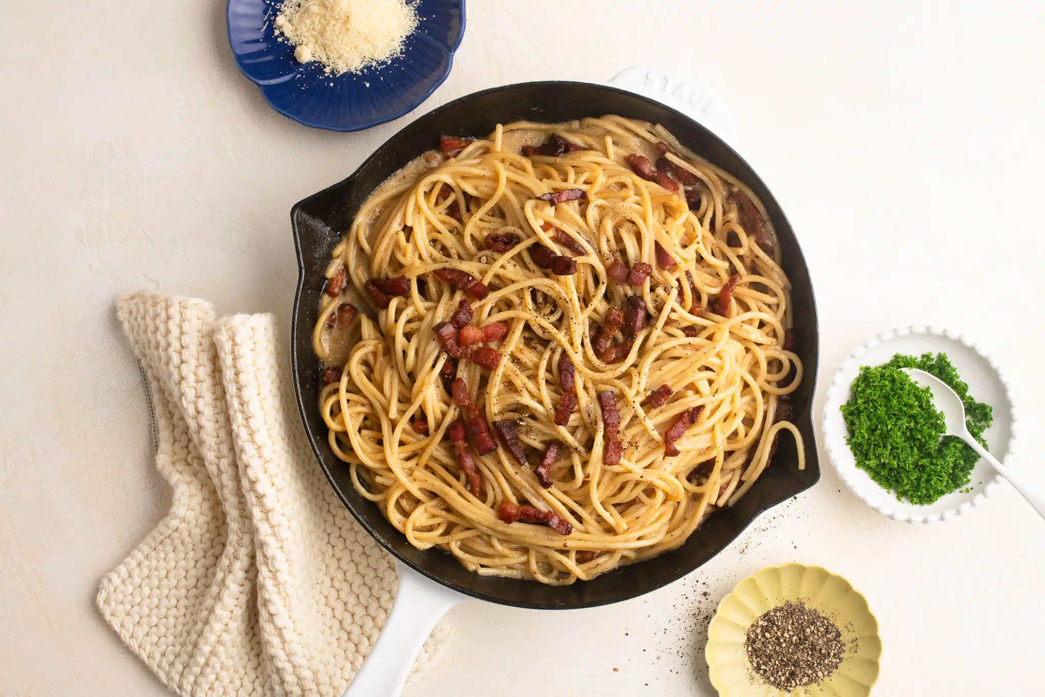 I grew up eating Spaghetti Carbonara made with cream, and I loved it! Growing up in Australia, I think Italian restaurants there made carbonara dishes with an Alfredo sauce; I wasn’t even aware of “Alfredo” until I spent a few years working in the US and found Fettucine Alfredo on the menu of every Italian restaurant. And the reason why I think Italian restaurants in Australia were serving Alfredo dishes disguised as carbonara is because an Alfredo sauce can be made in advance and reheated to order, whereas a true carbonara should be made to order and served immediately.
