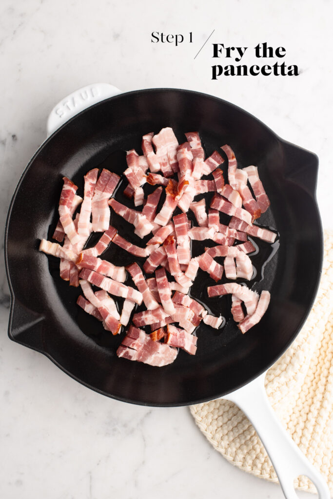 - Add the oil and pancetta to a large pan or cast-iron skillet (i.e. start cooking the pancetta in cold oil).
