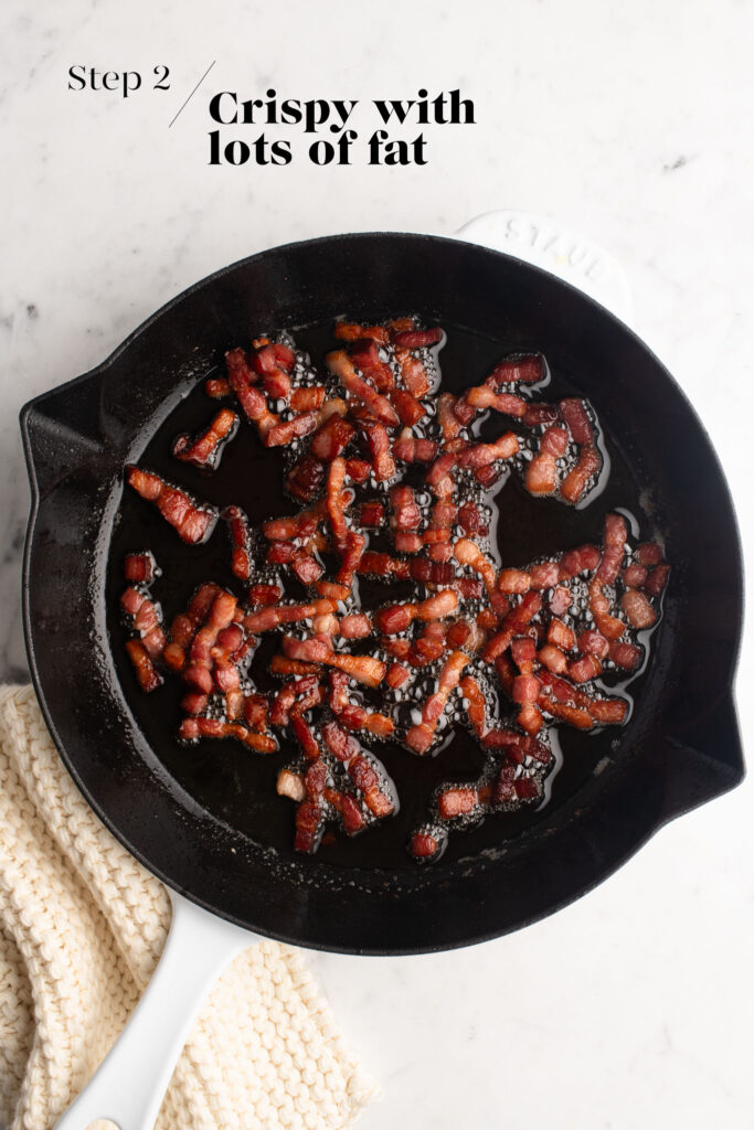 Note for US readers: Bacon and similarly smoked meats made in the US tend to have a high water content, so you will likely end up with a lot of water in the pan. After cooking, leave about 3-5 tablespoons of fat/liquid in the pan. Alternatively, try to source pancetta or guanciale produced in Italy.