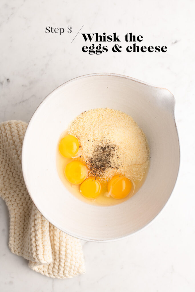 Whisk the eggs and cheese in a mixing bowl, together with a generous pinch of freshly ground black pepper (I like to add a lot).