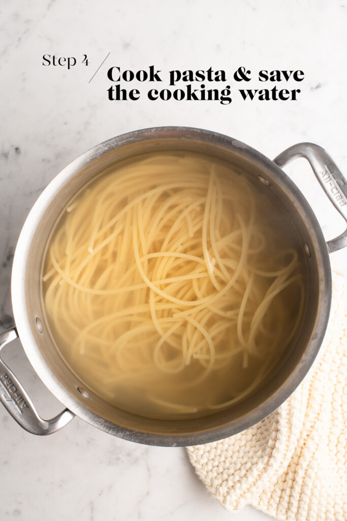 Once the pasta is cooked, take the pot off the heat. Do not discard the pasta cooking water. Transfer some of the pasta cooking water to a large jug.