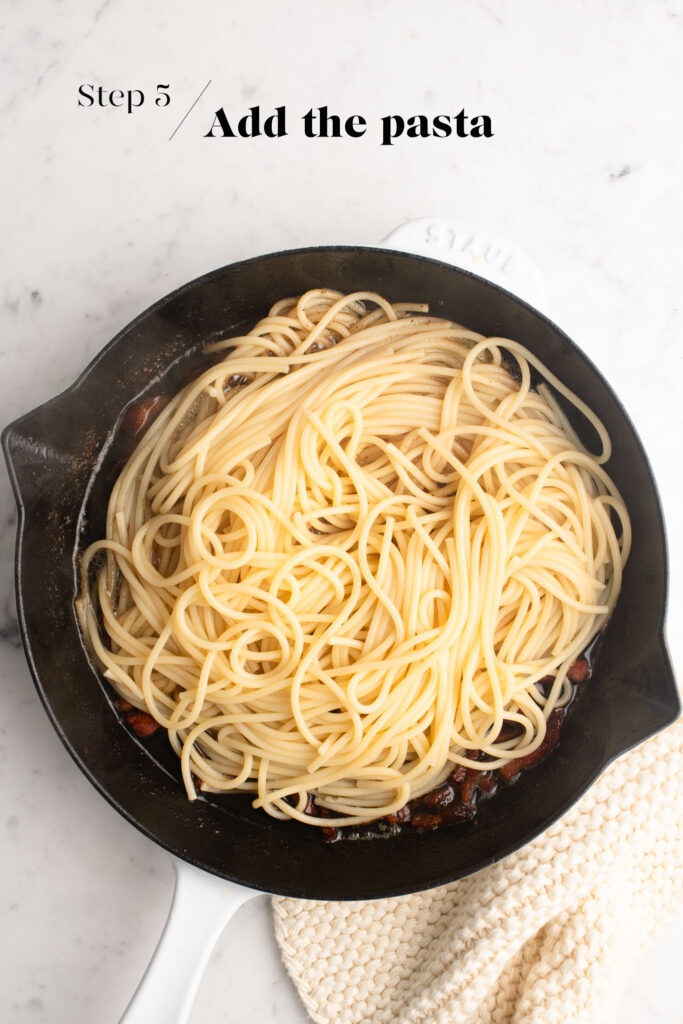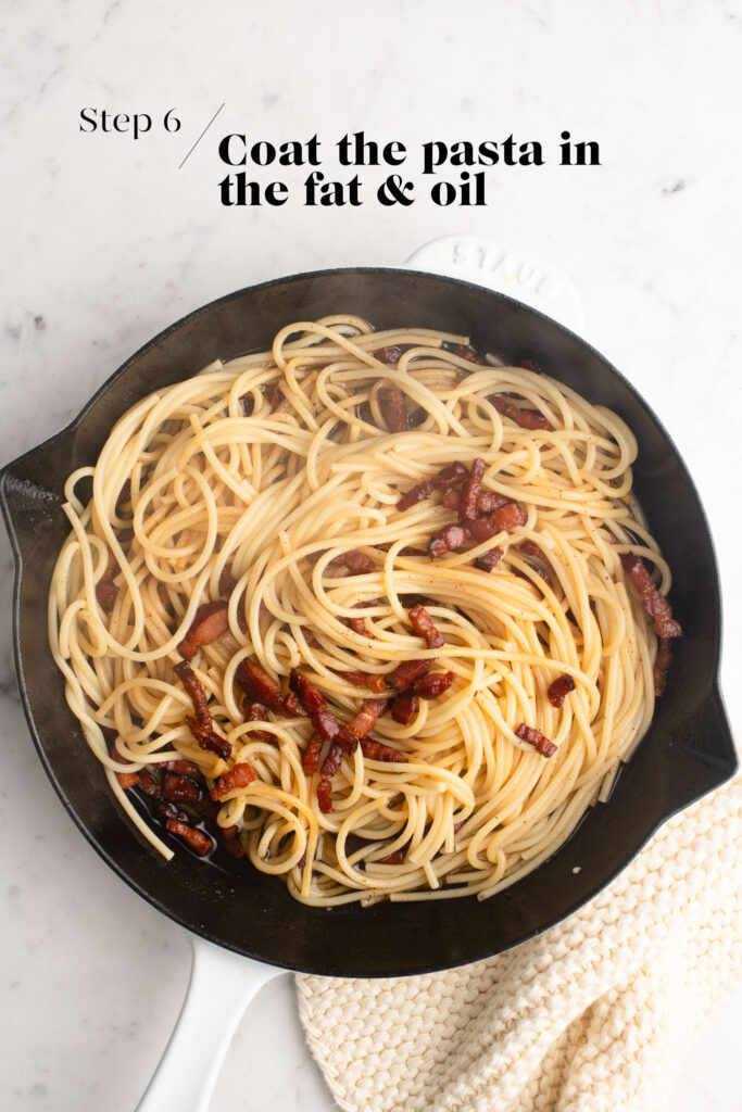 With the pan still on medium-high heat, turn the spaghetti in the fat and oil until all of the strands are nicely coated. As you do so, the liquid on the pasta will help to deglaze the pan, so all of the bacony juices on the pan will colour and flavour the pasta.