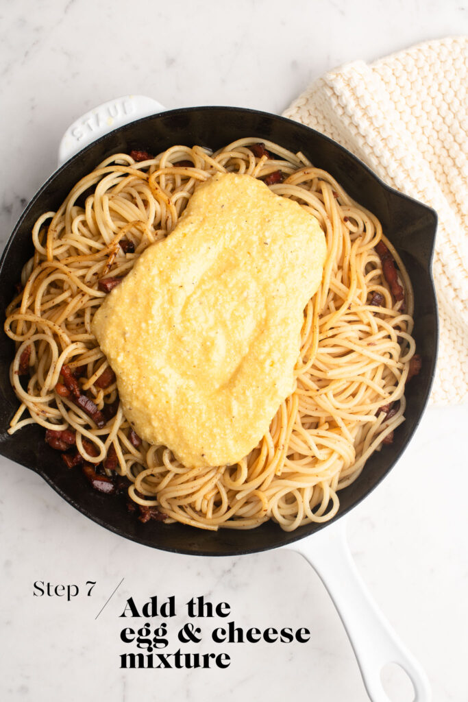 - Second step: coat the pasta in egg and cheese. Evenly distribute the egg and cheese through the pasta to minimise the chances of it scrambling. In addition, take the pan off the heat before you add the egg mixture.