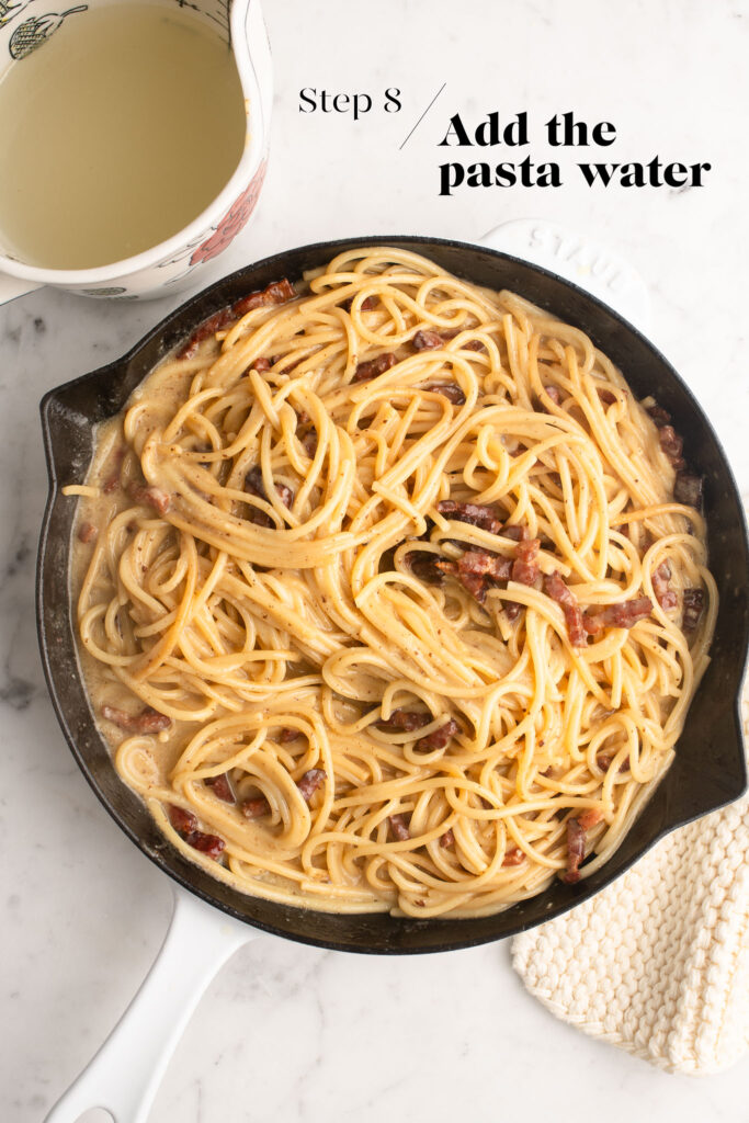 - Third step: coat the pasta in cooking water. The pasta cooking water is full of starch which will help to thicken the sauce. Add a little at a time until the sauce is the consistency that you like. If the pasta strands have been evenly coated in fat, egg and cheese, once you add the starchy water, the sauce should form quickly and easily.